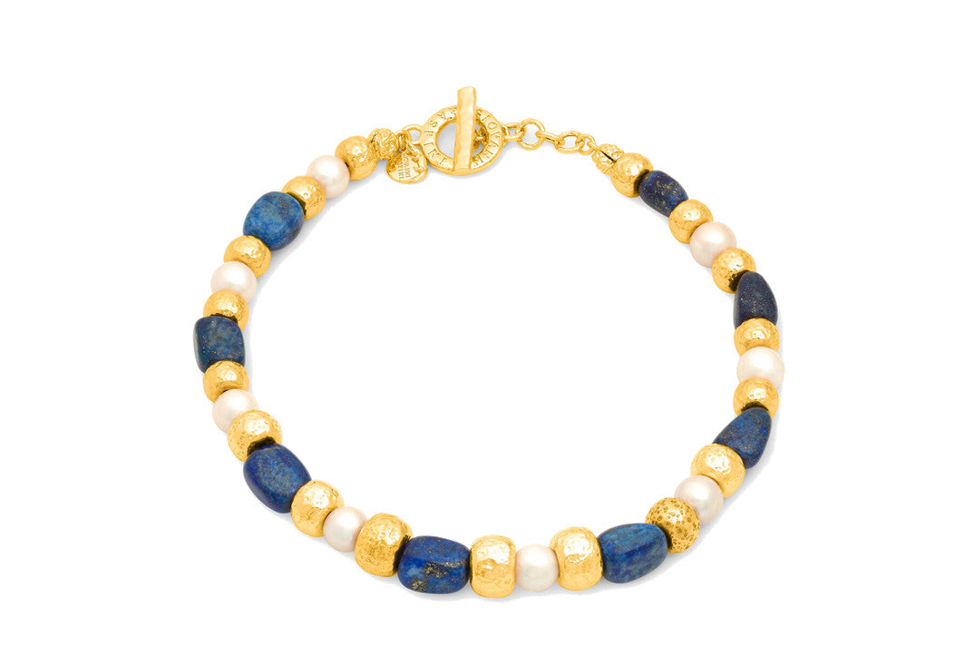 Questa raffinata collana unisce armoniosamente elementi in bronzo dorato martellato, perle naturali d'acqua dolce e preziosi segmenti in lapislazzuli. Le superfici martellate, realizzate a mano, esaltano la luminosità del metallo e dialogano con la delicatezza delle perle e l'intensità del blu lapislazzulo. La chiusura a T-bar, rifinita con la stessa lavorazione artigianale, aggiunge praticità senza rinunciare allo stile. Un gioiello che racchiude tutto il fascino della fusione a cera persa e l'autentica maestria artigianale dell'azienda.