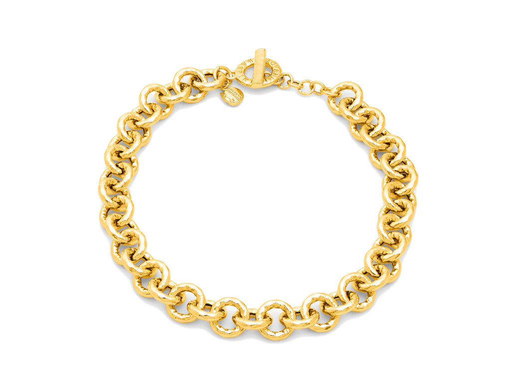 Una catena a maglia tonda in bronzo dorato 18 kt, lavorata con finitura martellata, dona vita a una collana luminosa e ricca di sfumature calde. La texture materica riflette la luce in modo naturale, creando un effetto raffinato e contemporaneo. La chiusura a T-bar, pratica e decorativa, aggiunge un dettaglio di stile che rende il gioiello ancora più distintivo.