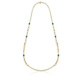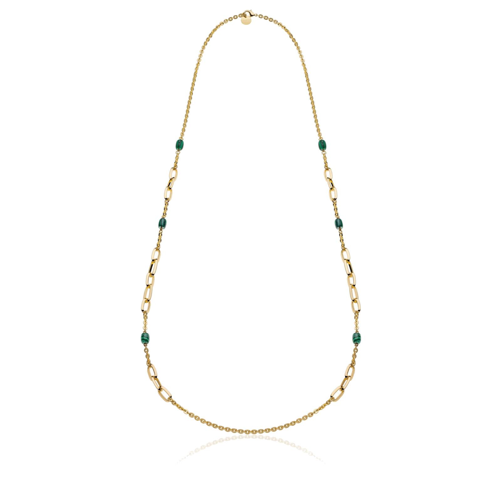 Collana lunga con catena forzatina fantasia, malachite verde e chiusura a moschettone. Lunghezza 113 cm.