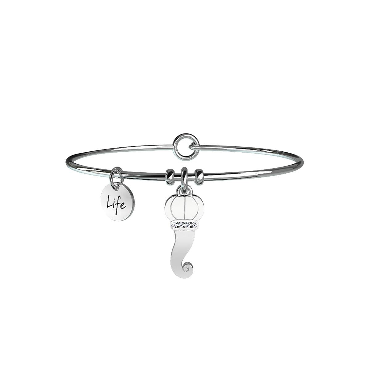 È l'arma per vincere ogni tua sfida, ti protegge dai guai che riserva la vita. Allontana l'invidia del male qui intorno, toccalo sempre, ogni mese, ogni giorno.Bangle in acciaio con ciondolo a forma di cornetto. • Incisione e cristalli sul ciondolo • Chiusura tonda • Misura unica, diametro 6 cm • Materiale: Acciaio 316L, Cristallo • Designed by Kidult in Italy