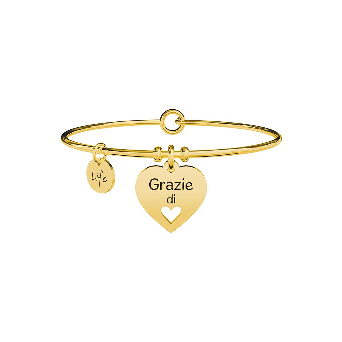 Un "grazie" sincero è la parola migliore, se detta ad alta voce dal profondo del cuore.Bangle in acciaio color oro giallo con ciondolo a cuore. • Incisione smaltata sul ciondolo • Chiusura tonda • Misura unica, diametro 6 cm • Materiale: Acciaio 316L con Pvd Oro • Designed by Kidult in Italy