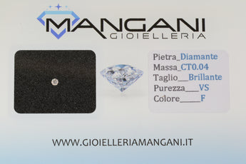 Diamante naturale in blister con una caratura di 0,04 il colore è F e la qualità VS. Il diamante è corredato da garanzia cartacea con le caratteristiche della pietra.