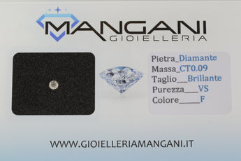 Diamante naturale in blister con una caratura di 0,09 il colore è F e la qualità VS. Il diamante è corredato da garanzia cartacea con le caratteristiche della pietra.