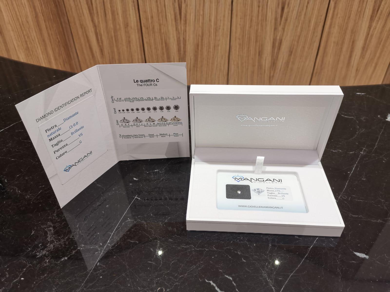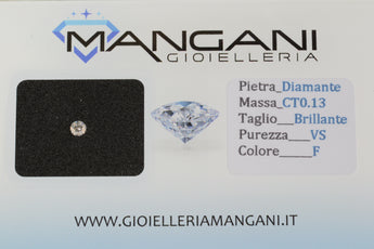 Diamante naturale in blister con una caratura di 0,13 il colore è F e la qualità VS. Il diamante è corredato da garanzia cartacea con le caratteristiche della pietra.