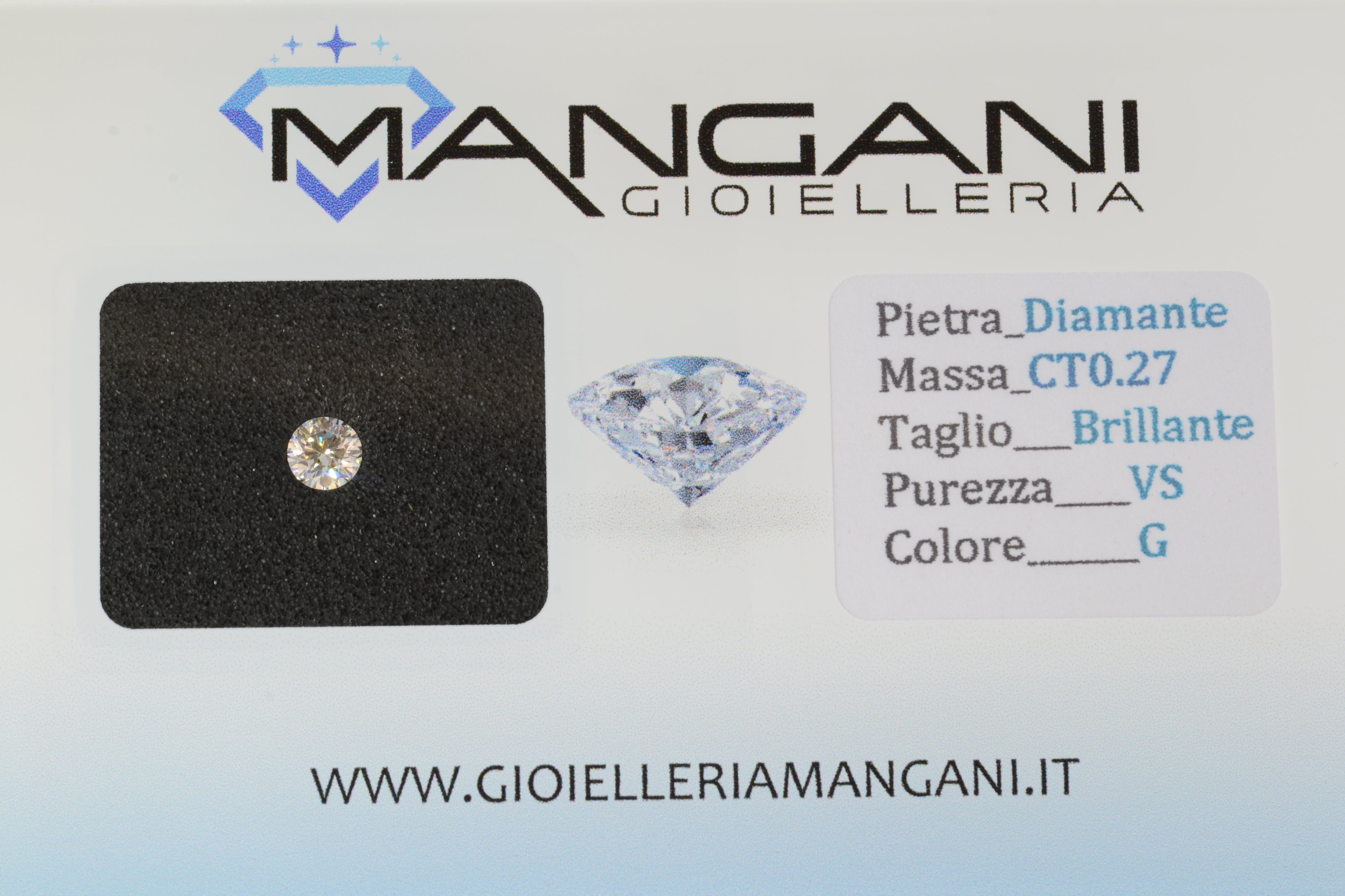 Diamante naturale in blister con una caratura di 0,27 il colore è G e la qualità VS. Il diamante è corredato da garanzia cartacea con le caratteristiche della pietra.