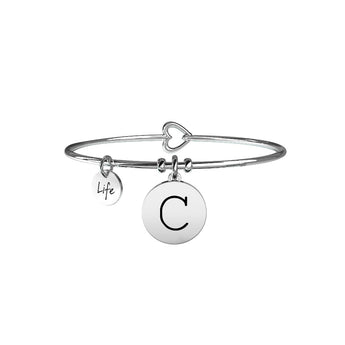 È l'iniziale del tuo nome, di una persona speciale o di qualcuno che ti sta a cuore. La tua lettera preferita, il principio di una parola, una frase, una storia. La vita è un alfabeto di emozioni.Bangle in acciaio con ciondolo tondo con lettera C. • Incisione smaltata sul ciondolo e cristallo sul retro • Chiusura a cuore • Misura unica, diametro 6 cm • Materiale: Acciaio 316L, Cristallo • Designed by Kidult in Italy