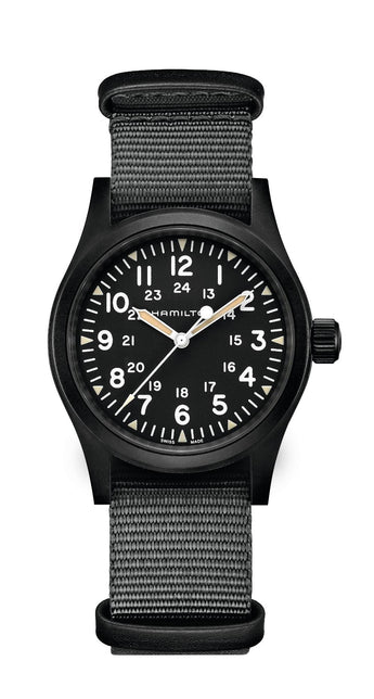 Khaki Field Mechanical è un orologio Iconico di Hamilton di ispirazione Militare. La Cassa è completamente sabbiata e ricoperta in PVD nero con quadrante con indici color Radio Anticato, un abbinamento molto riuscito. Movimento a Carica Manuale.