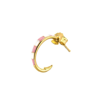 Orecchino singolo della linea Rue des Mille, realizzato in argento 925 con doratura di colore giallo. Dipinto a mano con lavorazione a righe bianche e rosa.