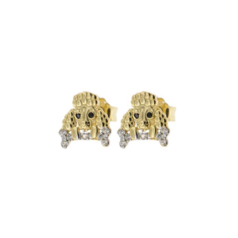 Orecchini Rue des Mille in argento 925 bagnati su oro giallo 18kt a forma di Barboncino con un osso in bocca dove ci sono incassate delle pietre.