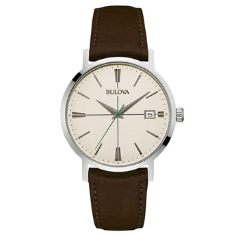 Orologio Bulova da uomo, cassa in acciaio inossidabile con un diametro di 39 mm e uno spessore di 8 mm. Il vetro è minerale. Il meccanismo è al quarzo con funzione di solo tempo. Il cinturino è in pelle marrone e fibbia con ardiglione. Water Resistant.