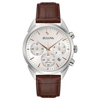 Orologio Bulova da uomo co cassa in acciaio inossidabile del diametro di 42 mm e uno spessore di 12 mm. Il quadrante è di colore silver. Il meccanismo è al quarzo 262 kHz Precisionist con funzione di orario, datario e cronografo. Il vetro è in zaffiro antigraffio. Il cinturino è in pelle marrone e fibbia con ardiglione. Water Resistant.