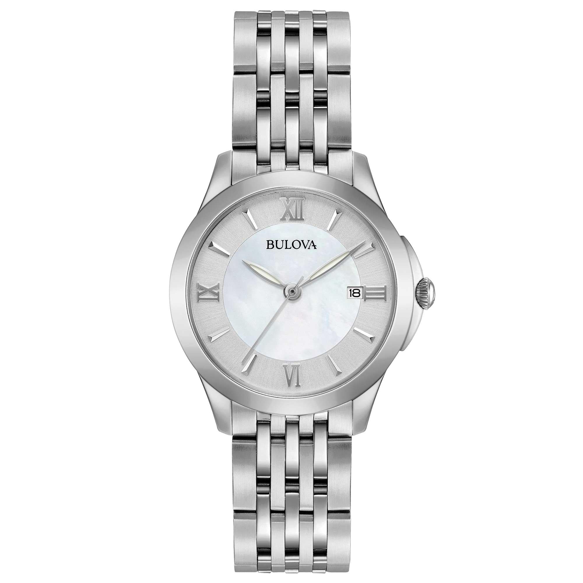 Orologio Bulova da donna, cassa in acciaio inossidabile con il diametro di 27 mm e uno spessore di 6 mm. Il quadrante è di colore silver, vetro minerale. Il bracciale è in acciaio inossidabile. Il meccanismo è al quarzo con funzione di solo tempo. Water Resistant.