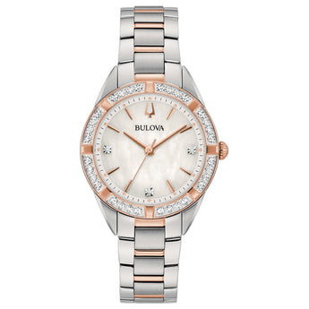 Orologio Bulova da donna, cassa in acciaio inossidabile con un diametro di 32 mm e uno spessore di 8 mm. Il quadrante è in madreperla, vetro in zaffiro antigraffio e finitera cassa bicolore in acciaio e oro rosa. Il meccanismo è al quarzo con funzione di solo tempo. Water Resistant. Bracciale in acciaio inossidabile con placcatura oro rosa.