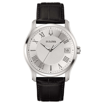 Orologio Bulova da uomo, cassa in acciaio inossidabile con un diametro di 41mm. Il quadrante è colore argento con numeri romani. Meccanismo al quarzo con funzione di orario e datario. Cinturino in pelle nera, fibbia deployante con pulsanti di rilascio. La resistenza all'acqua è di 3 bar.