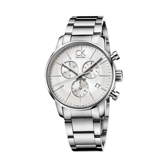 Orologio Ck, referenza K2G27146, cassa in acciaio inossidabile con un diametro di 42mm, il quadrante è di colore bianco con indici, il vetro è minerale. Il bracciale è in acciaio inossidabile. Il meccanismo è al quarzo Swiss Made, con funzione tempo e cronografo. La resistenza all'acqua è di 3 atm.