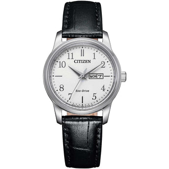 Orologio Citizen da donna linea classica. Cassa in acciaio inossidabile, cinturino in morbida pelle di colore nero. Il quadrante è bianco con numeri arabi. Il meccanismo al quarzo con funzione eco drive a carica solare ha una riserva di carica di circa 6 mesi. Le funzioni sono orario e datario day date. L'impermeabilità è di 5 atm.