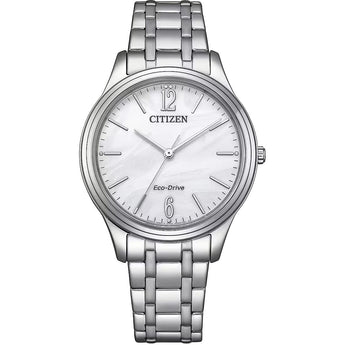 Grazie alla tecnologia Eco-Drive, si ricarica con qualsiasi fonte di luce e non richiede mai il cambio della batteria, garantendo sostenibilità e autonomia. La cassa da 34 mm in acciaio inox si unisce armoniosamente al bracciale in acciaio argentato, dotato di chiusura deployante per un comfort ottimale.