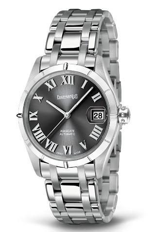 Orologio Eberhard Aquadate in acciaio con meccanismo automatico, vetro zaffiro antigraffio con lente sul datario, corona a vite MARIGNAN con particolari in oro bianco 18kt, fondo serrato da 6 viti. Bracciale charme in acciaio.