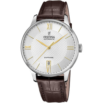 Orologio Festina da uomo, referenza F20484/2, cassa in acciaio inossidabile di forma rotonda con un diametro di 41,5 mm e uno spessore di 11,2 mm. Il quadrante è di colore bianco con indici applicati. Il vetro è in zaffiro antigraffio. Il meccanismo è automatico con funzione di solo tempo. La resistenza all'acqua è di 5 Atm. Il cinturino è in pelle marrone.