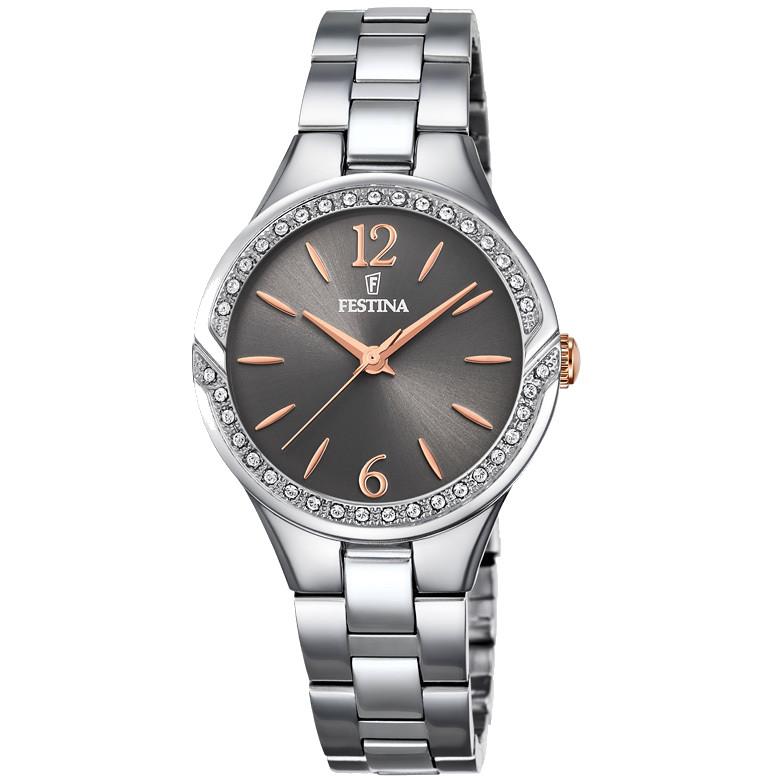 Orologio Festina, referenza F20246/2, cassa in acciaio inossidabile di forma rotonda con un diametro di 28 mm, il quadrante è di colore nero con indici applicati di colore oro rosa. Il meccanismo è al quarzo con funzione solo tempo. Il vetro è minerale. Il bracciale è in acciaio inossidabile 316l. La resistenza all'acqua è di 5 Atm.