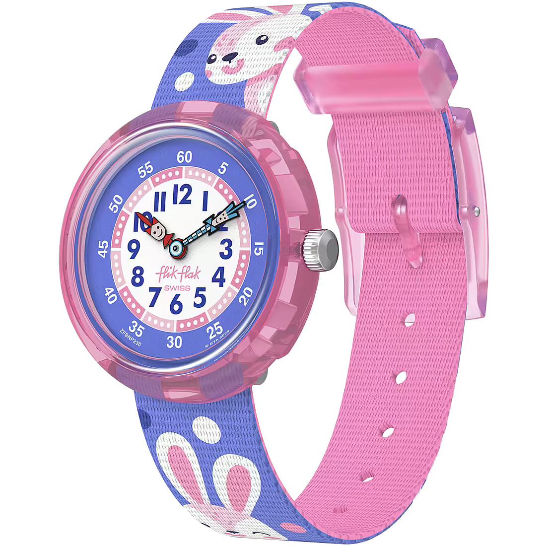 Scopri l'orologio Peek-A-Bunny di Flik Flak, un orologio solo tempo pensato per i bambini della collezione Friends Fur-Ever. Con una cassa rotonda in plastica di origine biologica di colore rosa, questo orologio ha un diametro di 31,85 mm, perfetto per il polso di ogni bambino. Il quadrante viola con numeri arabi facilita la lettura dell'ora, mentre il design giocoso e allegro stimola la curiosità e l'apprendimento.