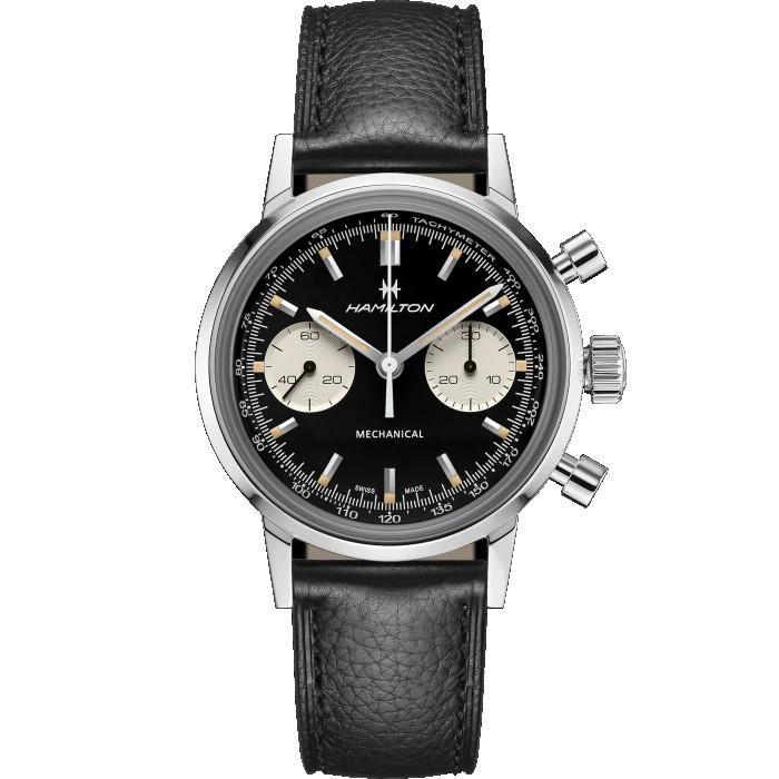 Orologio Hamilton American Classic Intra-Matic Chronograph H, referenza H38429730, cassa in acciaio inossidabile con un diametro di 40mm, vetro in zaffiro antigraffio bombato con doppio trattamento antiriflesso. Il quadrante è di colore nero con indici applicati. Il movimento è cronografo a carica manuale calibro H-51 con una riserva di carica di circa 60 ore. La resistenza all'acqua è di 10 bar.