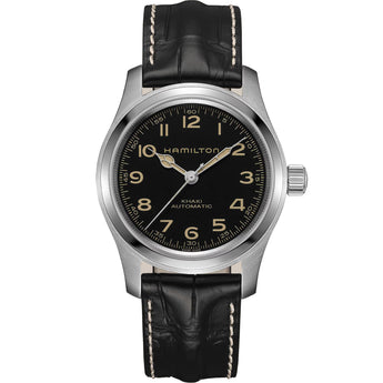Orologio Hamilton Khaki Field, cassa in acciaio inossidabile con un diametro di 42mm e uno spessore di 11mm. Il quadrante è di colore nero, vetro in zaffiro antigraffio. Meccanismo automatico calibro H-10 con funzione di solo tempo, riserva di carica fino a 80 ore. La resistenza all'acqua è di 10 bar. Il cinturino è in pelle con fibbia ad ardiglione.