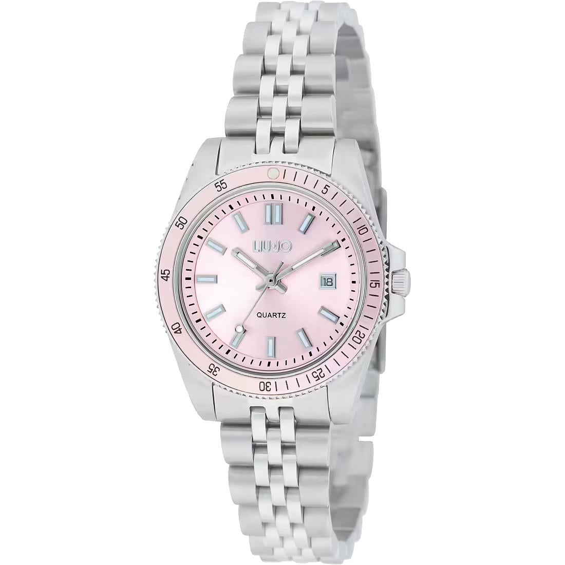 L'elegante orologio solo tempo da donna Liujo TLJ2318 della collezione COMPANY LADY è dotato di un affidabile movimento Seiko VJ12 e una cassa in acciaio inossidabile resistente all'acqua fino a 3 atm. Il quadrante rosa e il cinturino in acciaio argento aggiungono un tocco di classe a questo orologio da 33 mm. Completo di scatola originale Liujo.