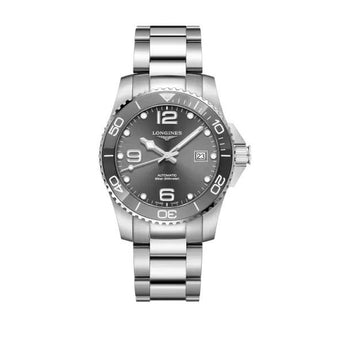 Orologio Longines HydroConquest, referenza L37814766, cassa in acciaio inossidabile e ghiera in ceramica, diametro della cassa 41mm di forma rotonda con uno spessore di 11,90mm. Il fondello è a vite con una resistenza all'acqua di 30 bar. Corona a vite e lunetta girevole unidirezionale. Il vetro è in zaffiro antigraffio con trattamento antiriflesso multistrato su entrambi i lati. Quadrante con lavorazione "a raggera" grigio. Lancette argentate lucide e numeri arabi e indici applicati. Il movimento è automatico con funzione di ora, minuti, secondi e data. Il calibro è L888. Movimento con frequenza di 25'200 alternanze orarie e riserva di carica di circa 72 ore.