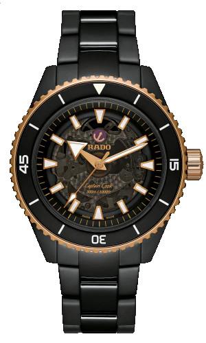 Orologio Rado Captain Cook, referenza R32127162, cassa in ceramica high tech e acciaio con un diametro di 43mm e uno spessore di 14,6mm. La corona è a vite con una resistenza all'acqua di 30bar, il vetro è in zaffiro con trattamento antiriflesso. Il fondello è a vista con vetro zaffiro. Il quadrante è scheletrico con indici e lancette colore oro rosa. Il movimento è automatico Swiss Made con una riserva di carica di 80 ore.