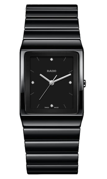 Orologio Rado Ceramica Diamonds, cassa in ceramica hi-tech con unn diametro di 30 mm e uno spessore di 7,6 mm. Il quadrante è nero con diamanti sugli indici. Il meccanismo è al quarzo Swiss Made con funzione di solo tempo. Il bracciale è in ceramica hi-tech e titanio. La resistenza all'acqua è di 5 bar.