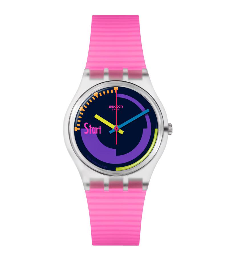 Ispirato all'icona Swatch degli anni '90, questo orologio retrò è un mix di colori e trasparenza. Il quadrante multicolore presenta lancette gialle, blu e rosa in una cassa trasparente con vetro eco-compatibile. Il cinturino rosa opaco trasparente è completato da passanti blu e trasparenti e una fibbia blu opaca trasparente.