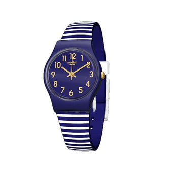 Quadrante blu scuro con indici e lancette dorate, alloggiato in una cassa in plastica satinata blu scuro. Cinturino e passante in silicone opaco blu scuro a righe bianche, e fibbia in plastica satinata bianca.