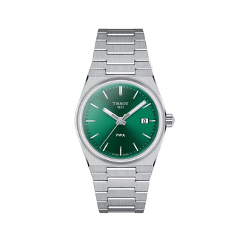 Orologio Tissot PRX, cassa in acciaio inossidabile con un diametro di 35 mm, quadrante di colore verde, vetro in zaffiro antigraffio. Il meccanismo è al quarzo Swiss Made con funzione di solo tempo. Bracciale in acciaio inossidabile con chiusura a farfalla con pulsanti. La resistenza all'acqua è 10 bar.