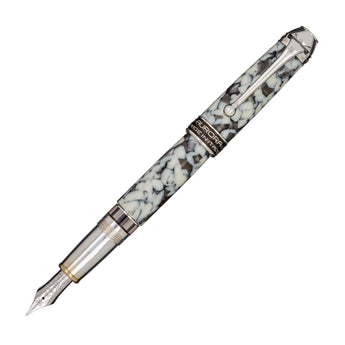 Penna Aurora in edizione limitata Gaius Julius Caesar, corpo penna e cappuccio realizzati in auroloide grigia e bianca. Finiture in argento massiccio. Pennino in oro massiccio 18 kt.