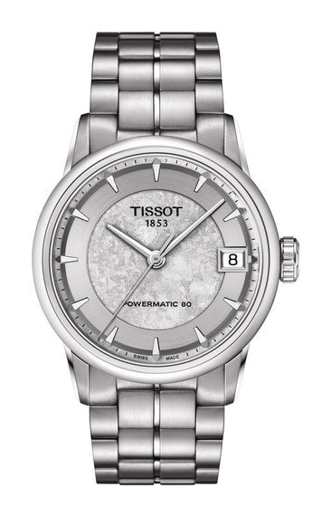 Orologio Tissot Luxury con Movimento a Ricarica Automatica Powermatic 80, con 80 ore di Riserva di Carica. Cassa e Bracciale in Acciaio, Quadrante di colore Argento e indici applicati. Indicazione della data, Vetro Zaffiro.
