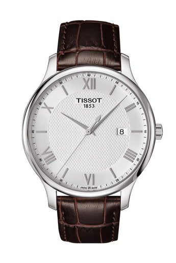 Orologio Classico dalle dimensioni importanti, cassa in acciaio e cinturino in pelle marrone, quadrante di colre Argento con numeri romani e indici, Vetro Zaffiro antigraffio.