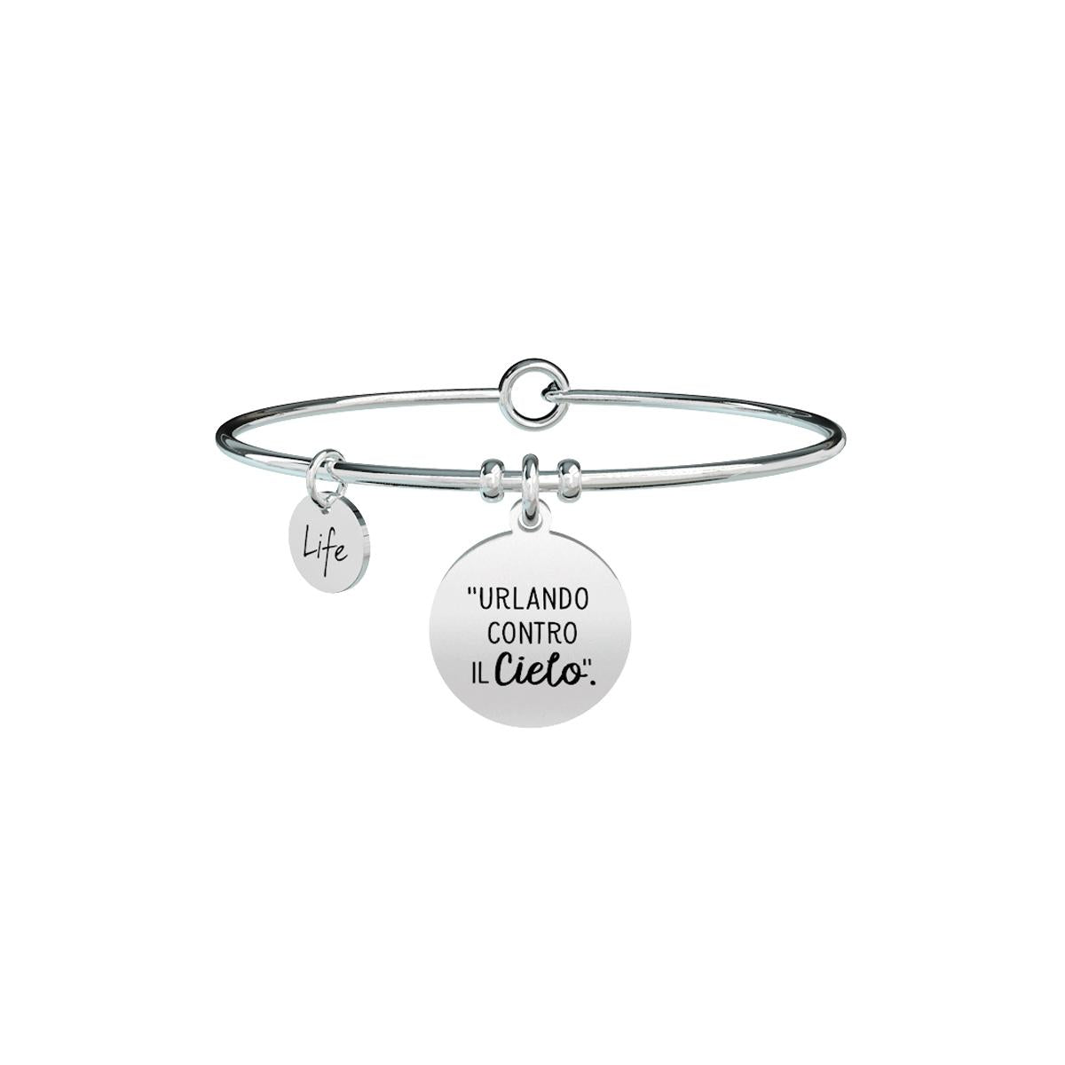 "Urlando contro il Cielo". LigabueLigabue Official Collection Bangle in acciaio con ciondolo tondo. • Incisione smaltata sul ciondolo • Chiusura tonda • Misura unica, diametro 6 cm • Materiale: Acciaio 316L • Designed by Kidult in Italy • Testo e Musica di Luciano Ligabue. © 1991 by Warner Chappell Music Italiana s.r.l. / Fuoritempo S.r.l. / Sugarmusic SpA