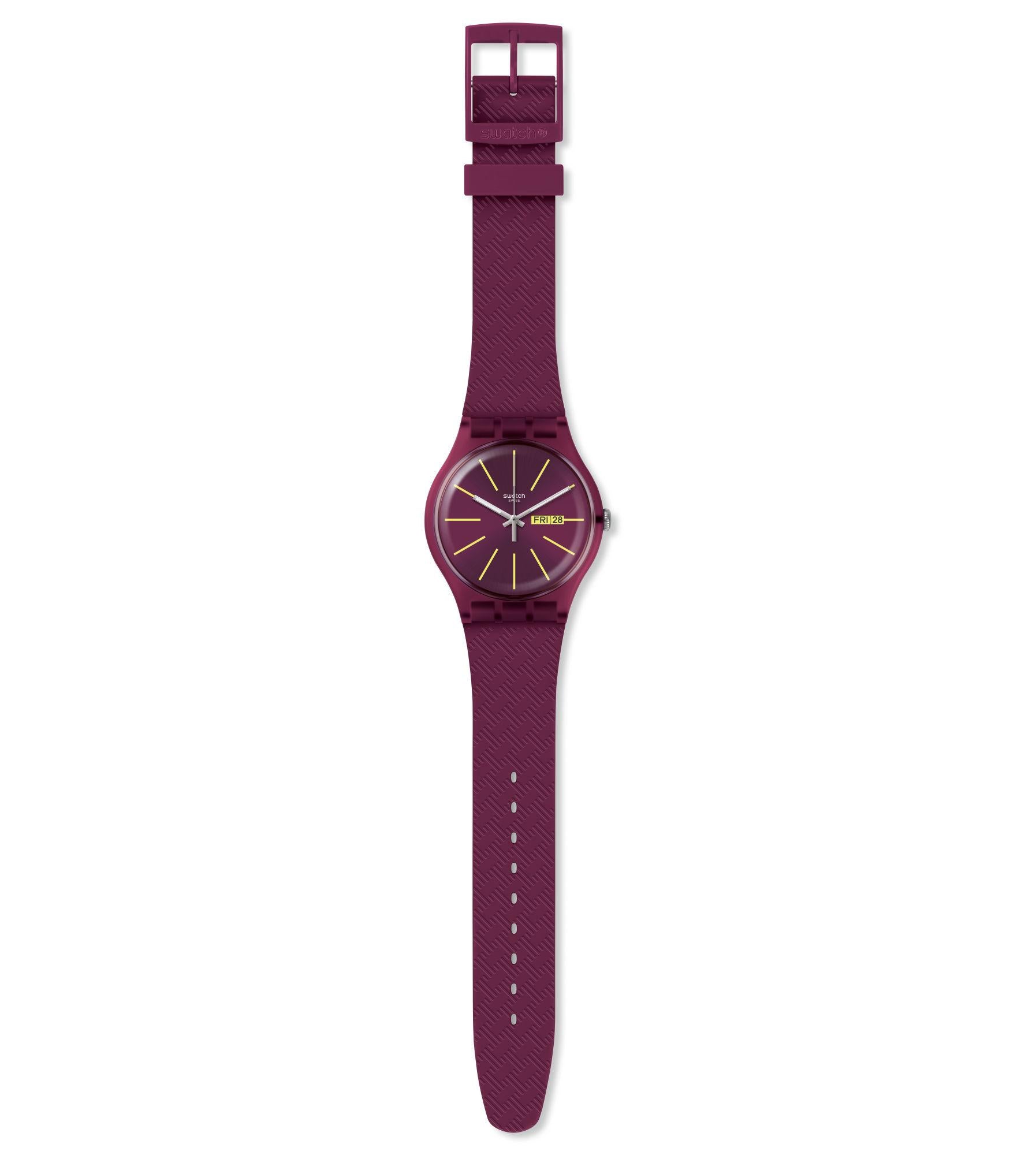 Brindiamo alla bella vita! WINERY (SUOR709) ha il cinturino a rilievo in una ricca tonalità merlot e il quadrante spazzolato in tinta, acceso da luminosi indici gialli.